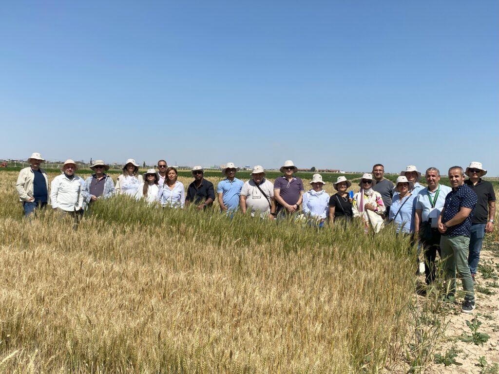 The participants of the TREATY International Soil Borne Pathogens Workshop observing the extent of root diseases and selecting elite bread-wheat lines during the field visits at the Bahri Dagdas International Agricultural Research Institute, Konya, Türkiye (Photo: CIMMYT)