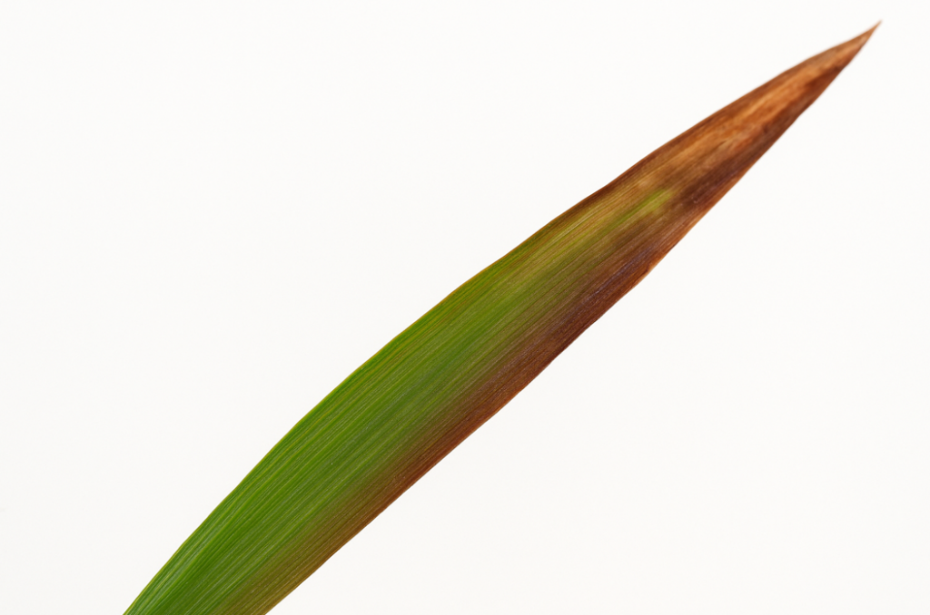 - Tip: Las hojas deficientes tienden a doblarse en su región media. Los síntomas aparecen primero en hojas intermedias que se desarrollan a la mitad del tallo.