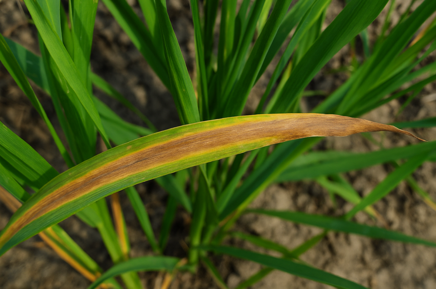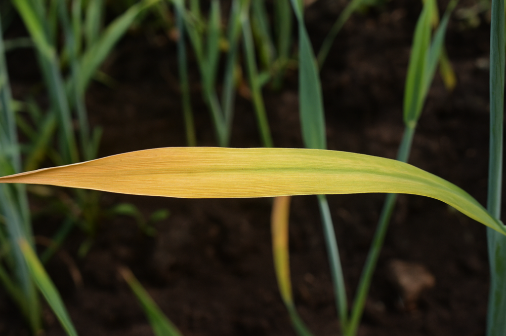 - Síntomas: Plantas largas, delgadas y con espigas pequeñas. Hojas viejas con clorosis amarillo claro que avanza hasta café.