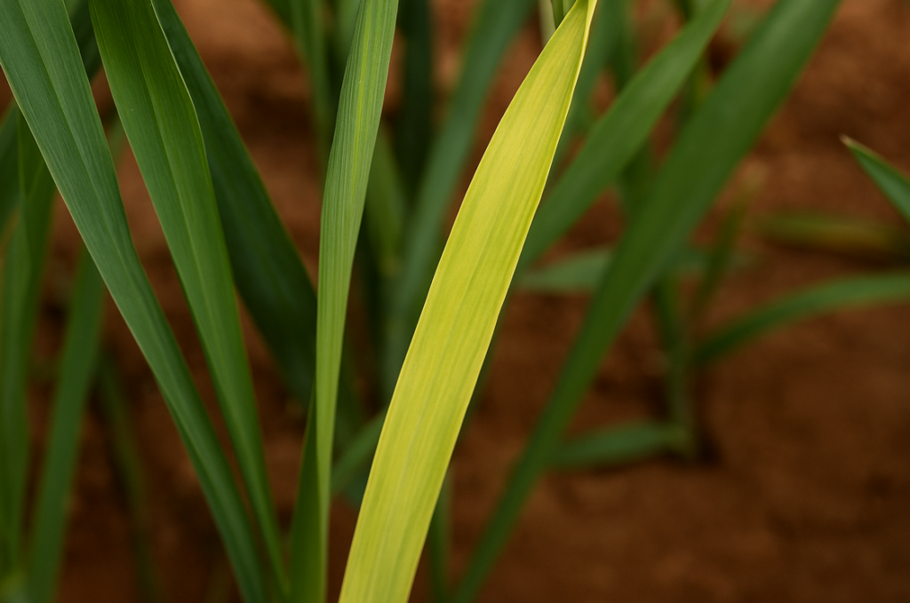 - Síntomas: Clorosis amarilla en hojas jóvenes (toda la hoja), similar a deficiencia de nitrógeno.
