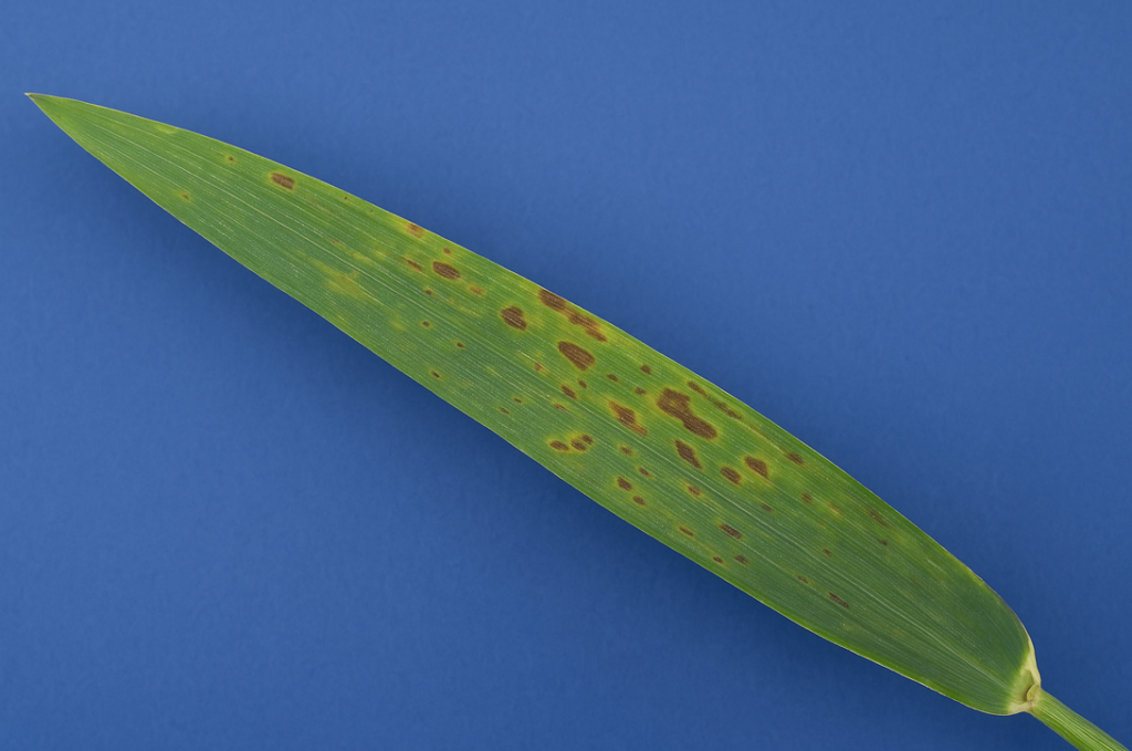 - Síntomas: Manchas verdes grisáceas en la parte media de la hoja, que se necrosan.