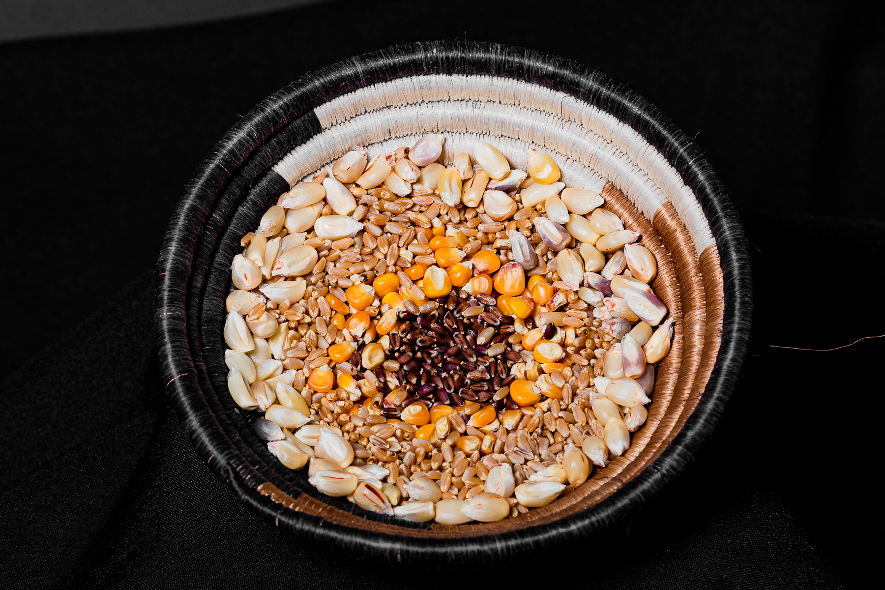 A basket contains an assortment of whole, unprocessed maize and wheat kernels. (Photo: Alfonso Cortes/CIMMYT)