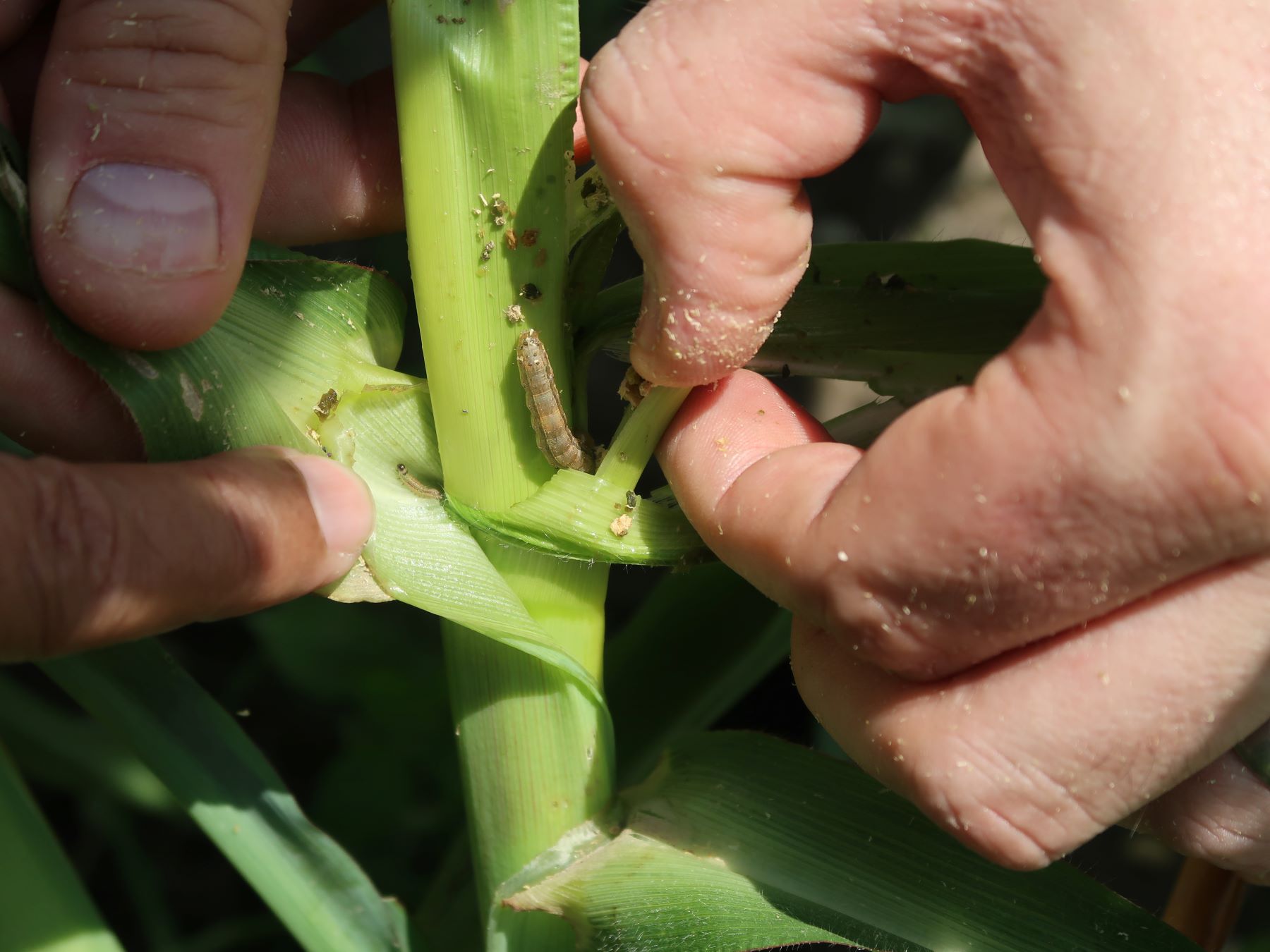 Fall armyworms are found on leaves in a maize field in Nepal. (Photo: Shailaja Thapa/CIMMYT)