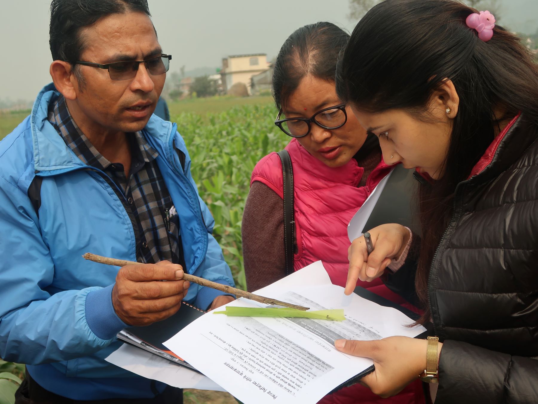 Training participants examine a fall armyworm on a maize leaf. (Photo: Bandana Pradhan/CIMMYT)