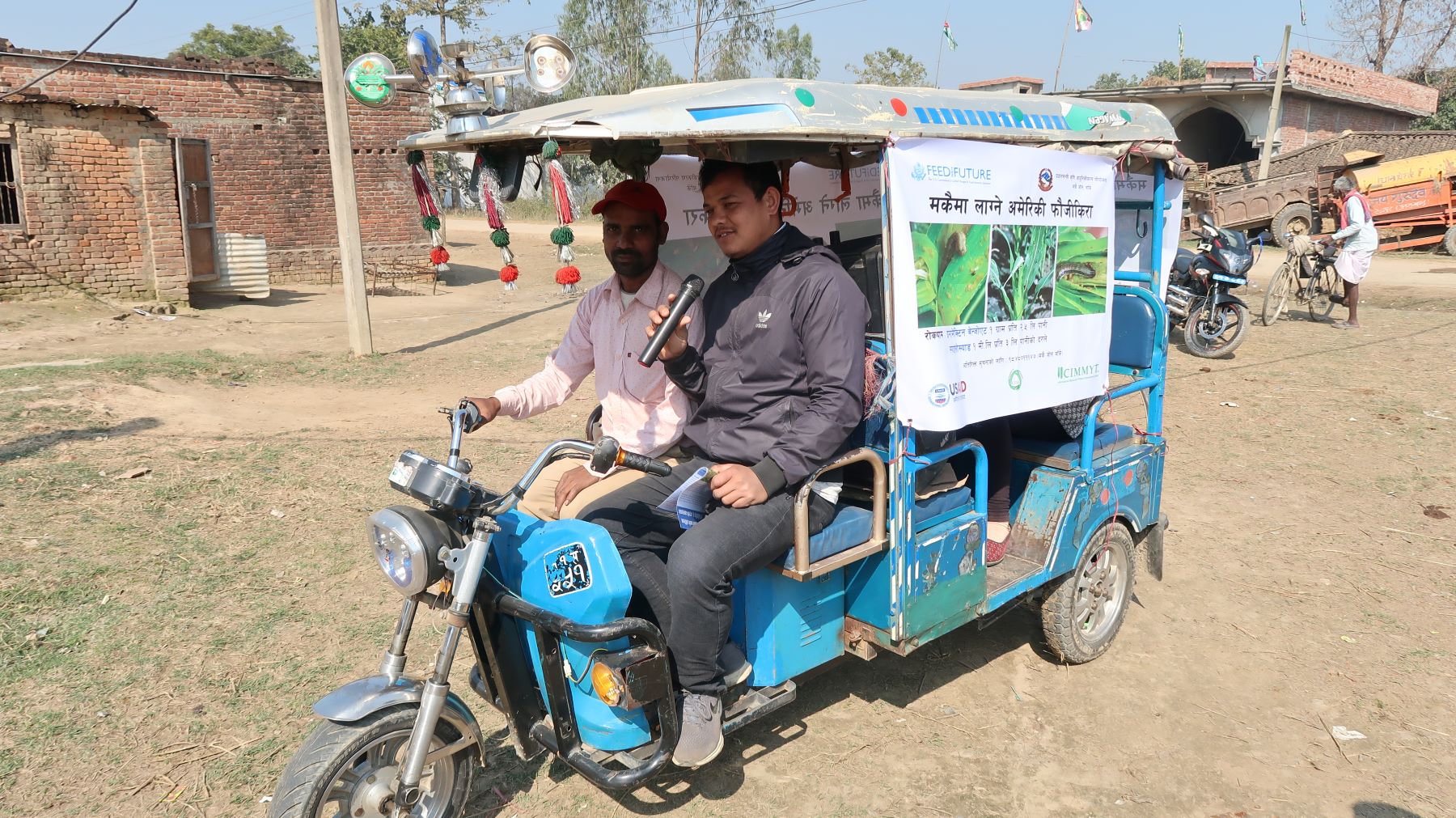 Outreach workers use an auto-rickshaw equipped with a sound system and infographics to disseminate information about armyworm in Nepal’s Banke district. (Photo: Darbin Joshi/CIMMYT.)