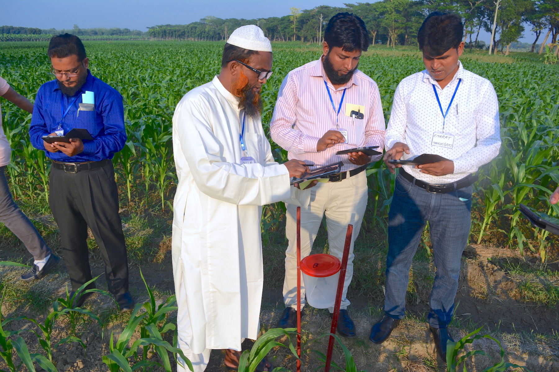 Participants of the Fighting Back Against Fall Armyworm trainings learning to collect field data through the Fall Armyworm Monitor web app in a farmer’s field in Chauadanga, Bangladesh. (Photo: Uttam Kumar/CIMMYT)