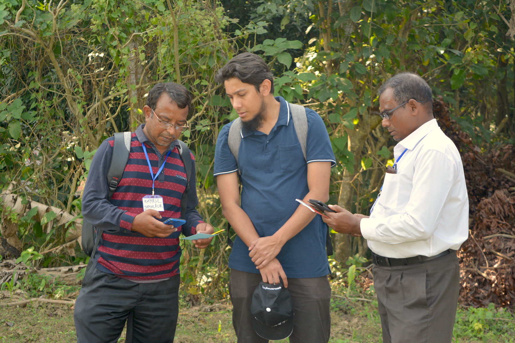 Participants and instructors of the Fighting Back Against Fall Armyworm trainings participate in a field session to work with the Fall Armyworm Monitor web app in Chauadanga, Bangladesh. (Photo: Uttam Kumar/CIMMYT)