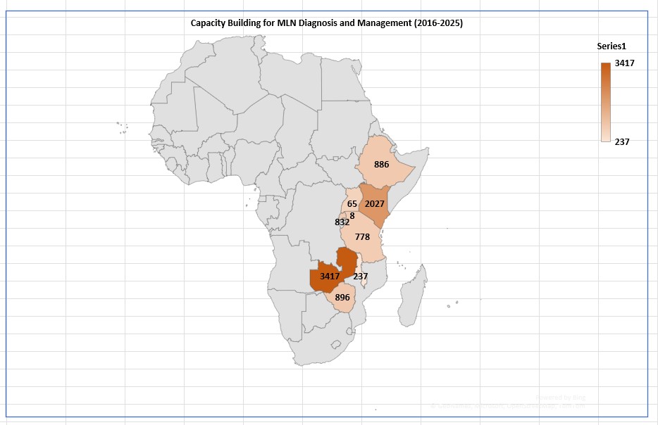 More than 5,000 extension workers, seed company staff, growers, and NARES partners were trained in MLN-free seed production, surveillance, rogueing, and phytosanitary compliance.