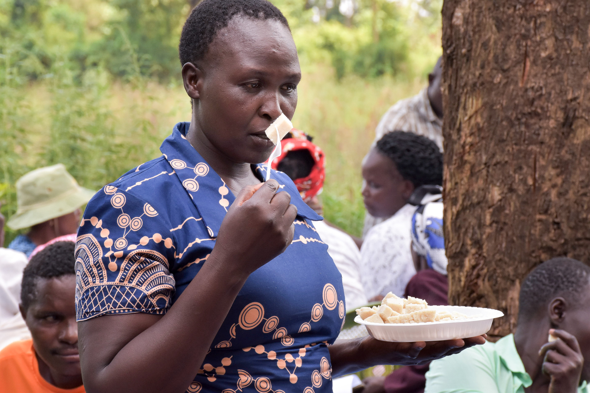 Participants were asked to rate the smell of different maize varieties, cooked as ugali, at a sensory evaluation in Kakamega County, Kenya. (Photo: Joshua Masinde/CIMMYT)