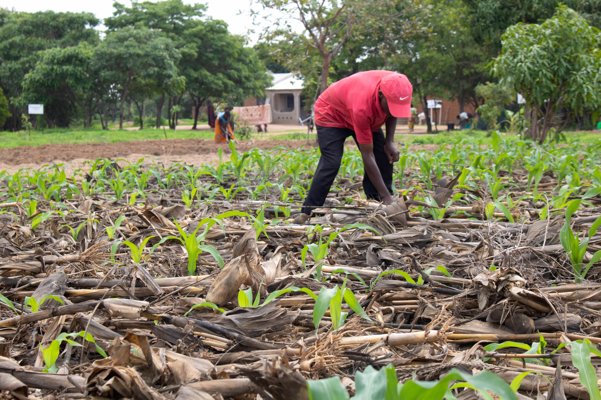 Matolino Zimba checks on the emerging maize crop, which has been covered in crop residue to conserve moisture, at the field school in Tiyese, Malawi. (Photo: Emma Orchardson/CIMMYT)