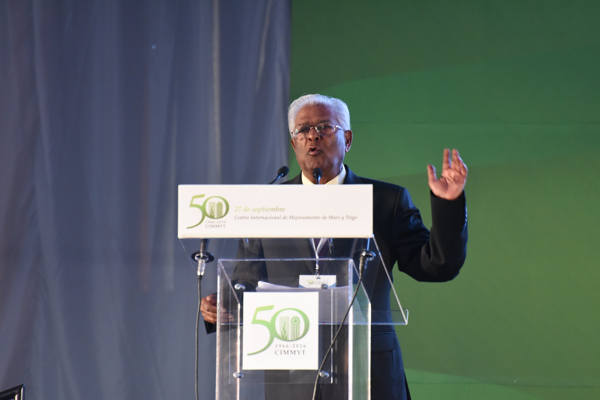 Sanjaya Rajaram speaks at the event to celebrate CIMMYT’s 50th anniversary in 2014. (Photo: Gerardo Mejía/CIMMYT)