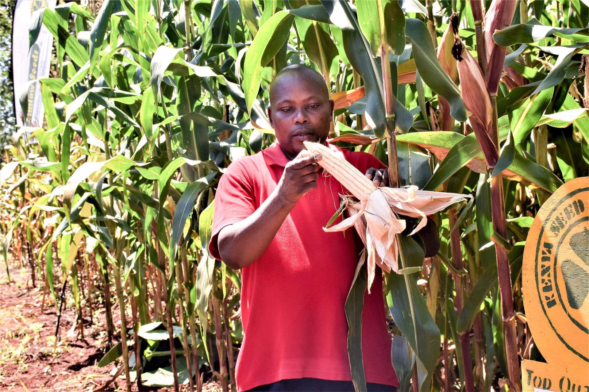 STAK chief executive officer Duncan Ochieng’ examines a maize cob in one of the demo plots. (Photo: Joshua Masinde/CIMMYT)