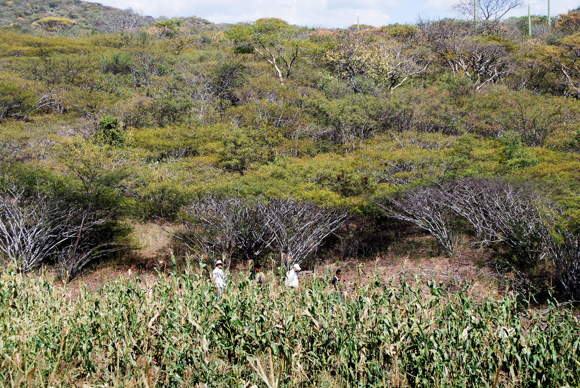 In the town of Tonahuixtla, Puebla, Mexico, a native maize field sits below a tree-covered hillside. The town has been active in reforestation efforts to control erosion. (Photo: Denise Costich/CIMMYT)